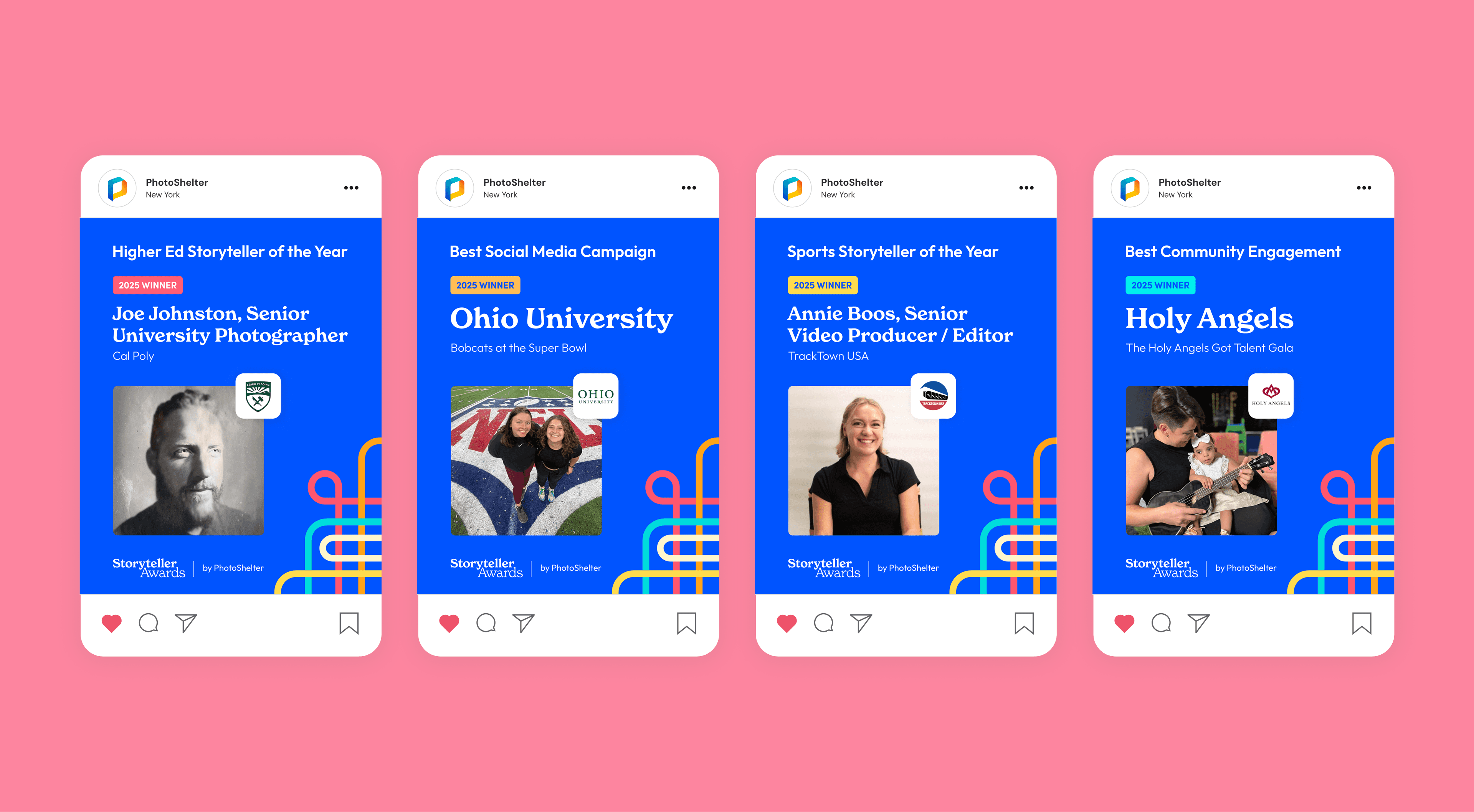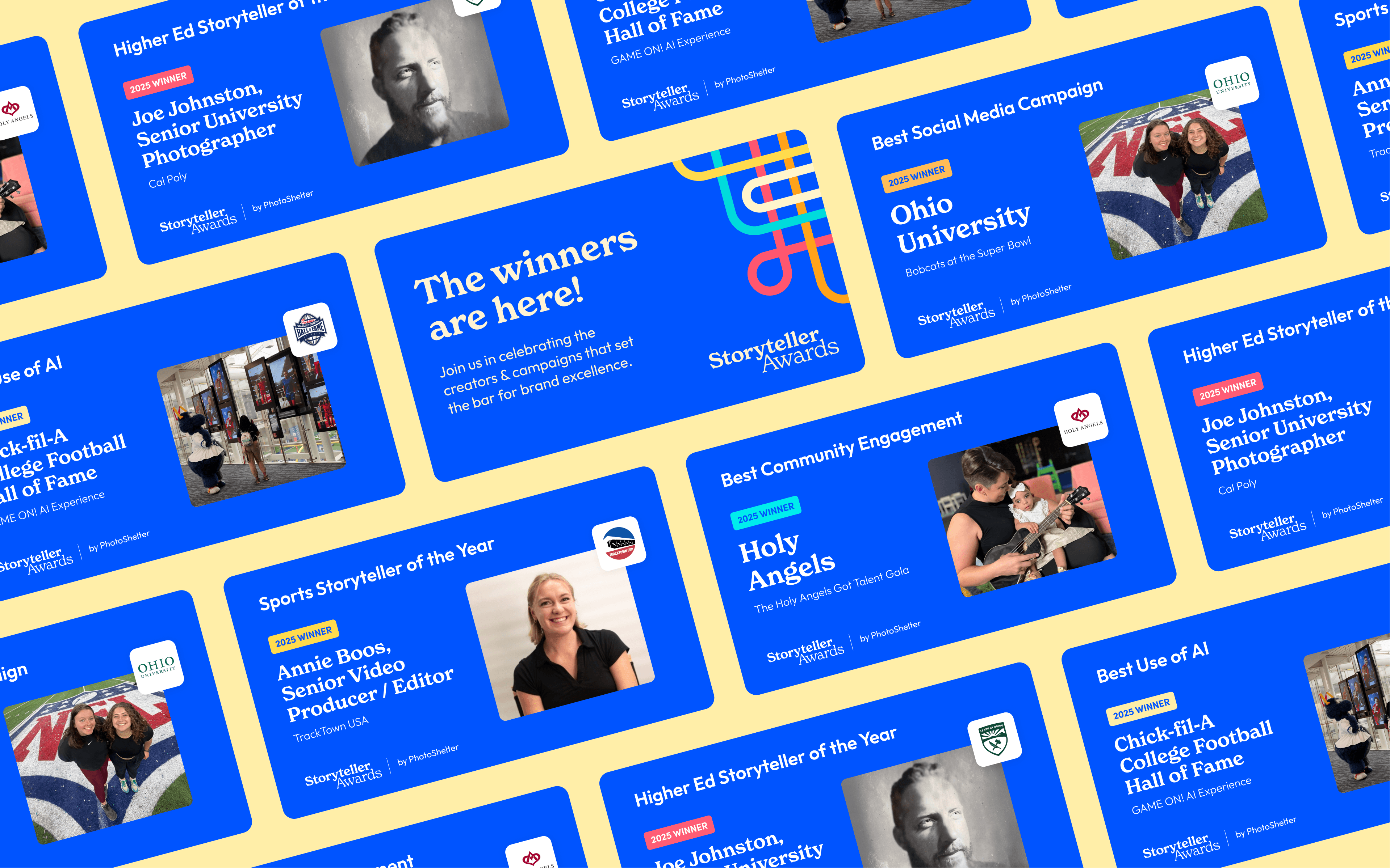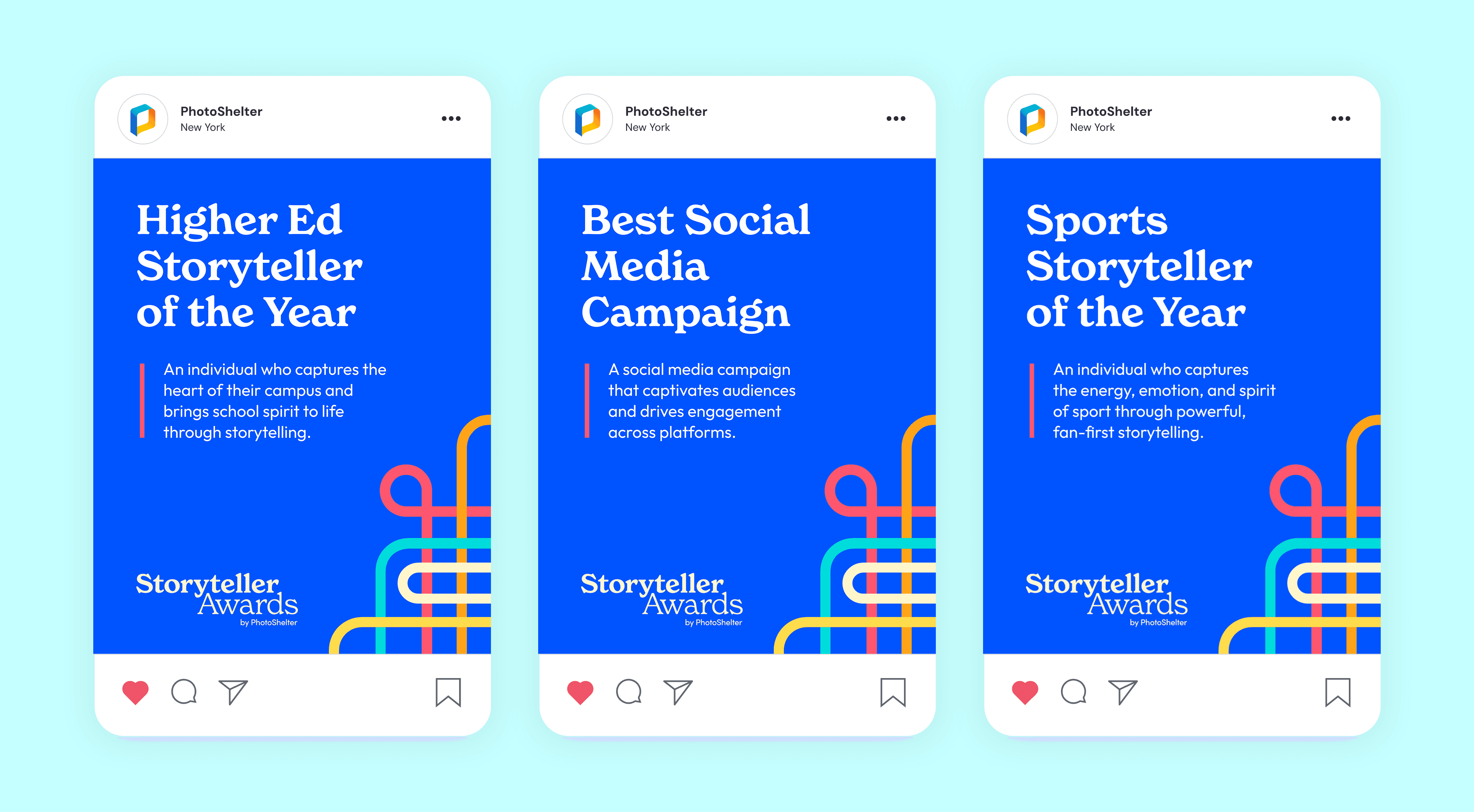 The Storyteller Awards is an annual event bringing together creators to celebrate campaigns that set the bar for brand excellence. The goal was to develop an identity that would honor standout work across industries and resonate with a diverse creative community. The design motif is rooted in the idea of interwoven lines, representing creativity, collaboration, and connection. The vibrant palette was chosen to give the event this bold and celebratory feel. The result was a flexible system that could adapt across digital platforms, printed materials, and branded merchandise. The identity included event graphics, social media templates, winner badges, and some awesome giveaway swag. The final identity created a cohesive, energetic experience that helped foster community and recognition among creators.